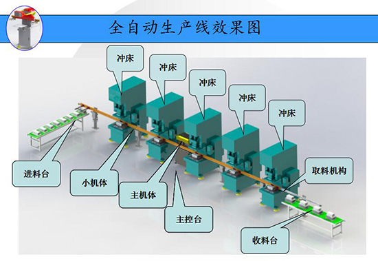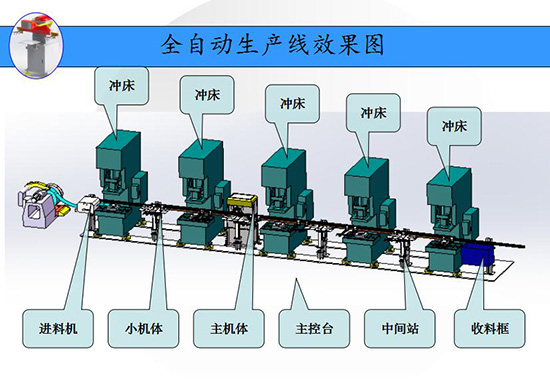 2、自動線采用單料上料方式,經過輸送定位送至輸送線末端位置,連桿式機械手抓取料片至一臺沖床模具內,同時將后面沖床模具內產品依次向后搬運,待沖床工作后連桿式沖壓機械手再次向后抓取送料。